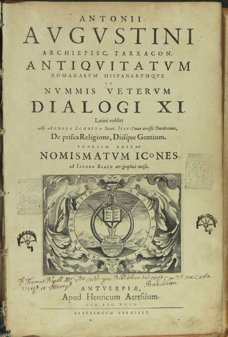 Agustí i Albanell, Antoni. Antonii Avgvstini ... Antiquitatum romanarum hispanarumqve in nummis veterum dialogi XI / latinè redditi ab Andrea Schotto ... ; cuius accessit duodecimus De prisca religione diisque gentium. Seorsim editae Nomismatvm icones / a Iacobo Biaeo aeri graphicè incisae. Antuerpiae : apud Henricum Aertssium, 1617. [16], 182, [26] pàgines, 68 fulls de làmina; 2º (34 cm). Prové del Convent de Santa Caterina de Barcelona adquirit per Tomàs Ripoll.
