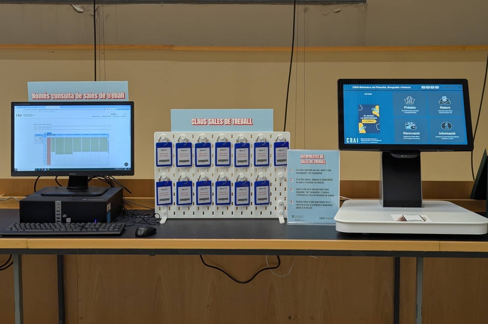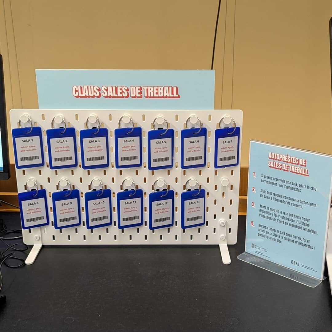 S'ha habilitat un espai al costat de les màquines d’autopréstec amb un ordinador exclusiu per consultar el calendari de disponibilitat de les sales, així com un expositor amb les claus corresponents. També hi trobaràs instruccions del procediment a seguir abans de fer l’autopréstec.